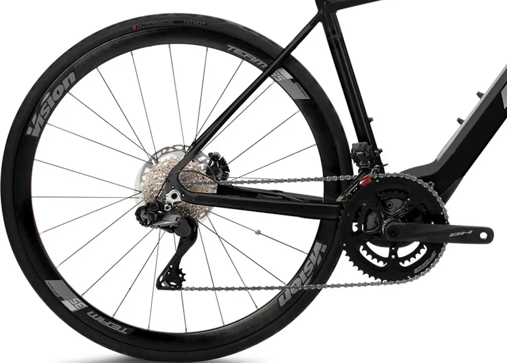 Rower elektryczny wyścigowy z aluminiową ramą, komponentami wyższej średniej klasy i hydraulicznymi hamulcami tarczowymi Shimano 105.
