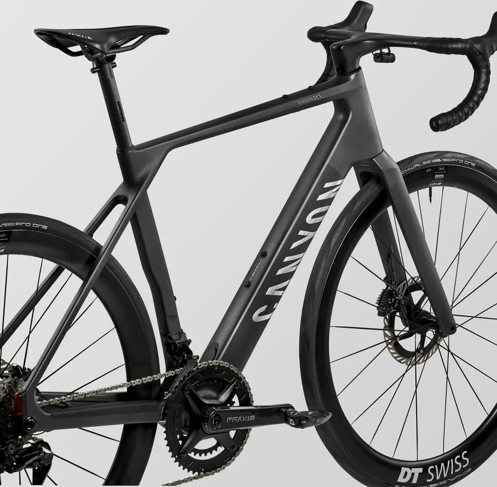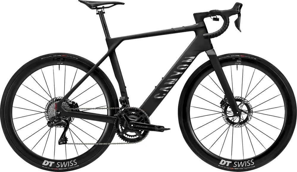 Canyon Endurace:ONfly CF, Canyon’s fastest, lightest endurance E-road bike, crafted using the highest grades of carbon to deliver class-leading stiffness-to-weight values. With aero-optimised tube forms., Axle dimension: 12×142 mm, Tyre clearance: 35 mm, Material: Carbon (CF), Weight: 1,000 g, Tire Clearance: 35c, Color: Light Black