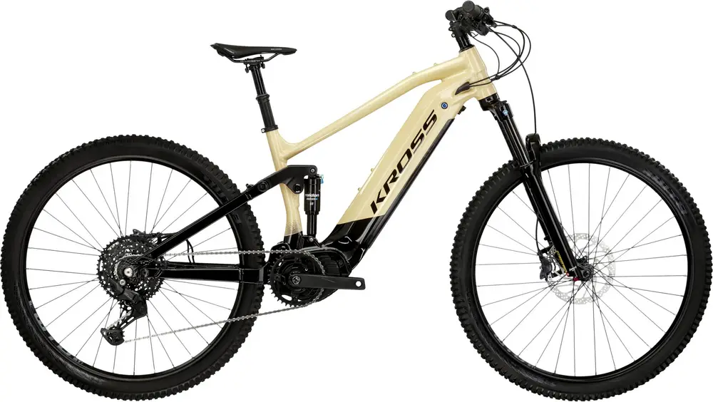 Rower elektryczny trail z pełnym zawieszeniem, aluminiową ramą 29″, osprzętem wyższej średniej półki i mechanicznymi hamulcami Shimano.