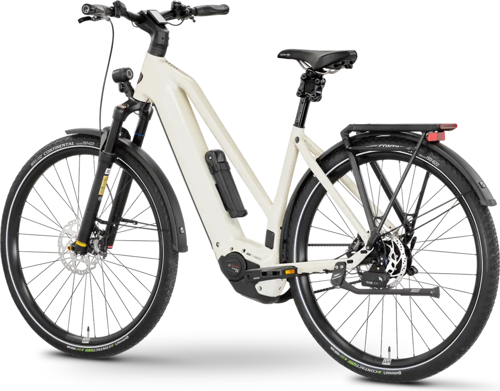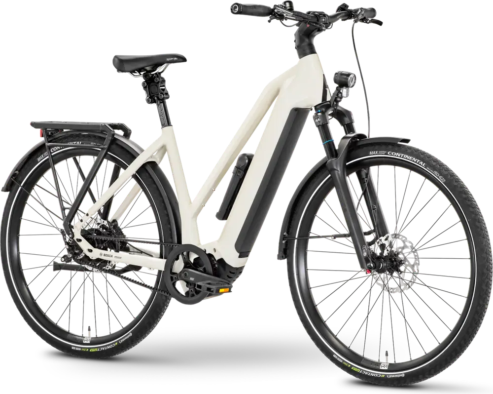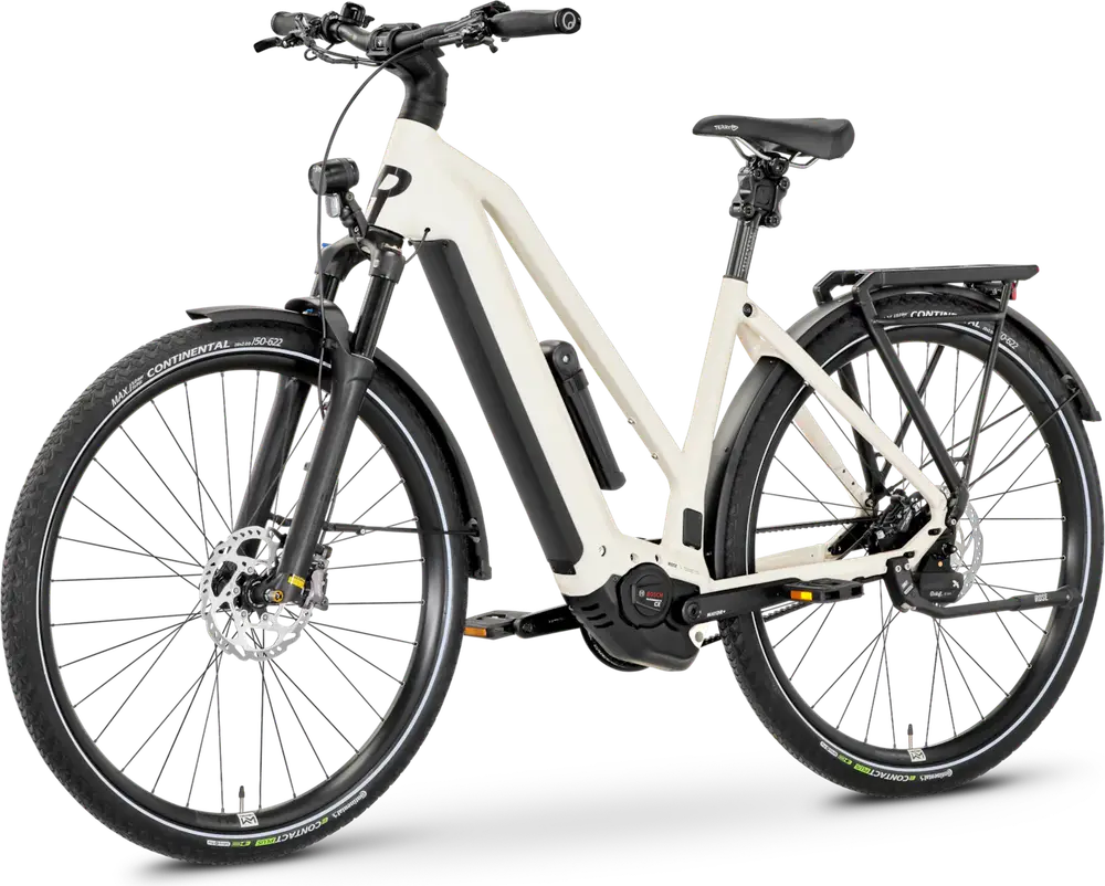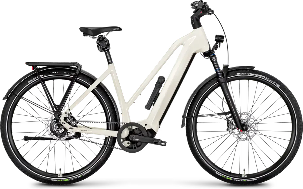 Wysokiej klasy e-bike trekkingowy z ramą typu trapez, który oferuje idealne połączenie sportowego wyglądu i komfortu. Jest to doskonały wybór dla aktywnych kobiet, które planują długie i wymagające wyprawy.