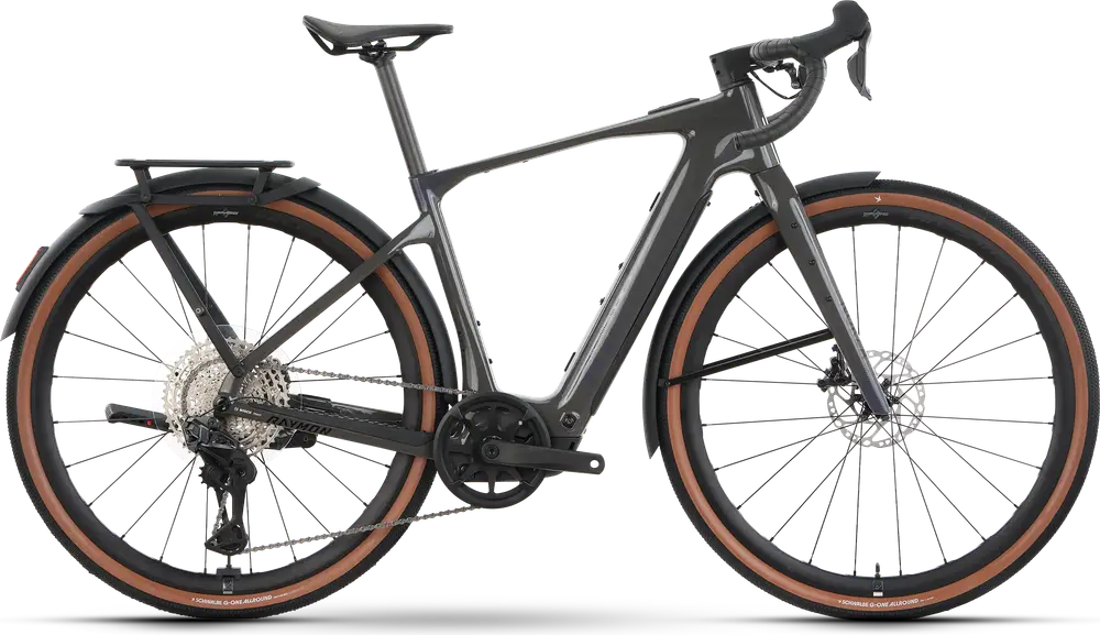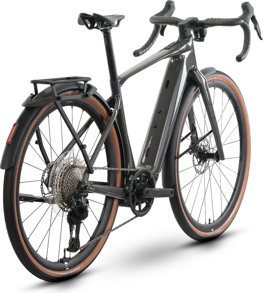 Rower elektryczny gravel z karbonową ramą, komponentami wysokiej klasy i hydraulicznymi hamulcami tarczowymi.