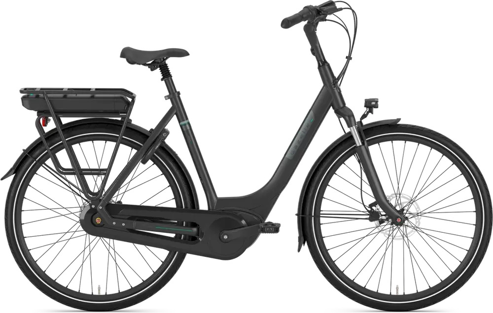 Lightweight aluminum frame with comfort geometry for stable and comfortable handling. Rear luggage rack integrated into the frame, low-step model with very low, wide entry and internal cable routing., Colors: Schwarz; Grün