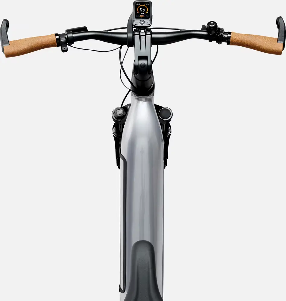 Oversize handlebar with ergonomic grips for comfortable and natural gripping and with bar ends for easier position changes and thus more comfort.