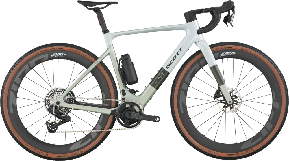 Rower elektryczny gravel z karbonową ramą, komponentami wysokiej klasy i hamulcami tarczowymi SRAM Force.
