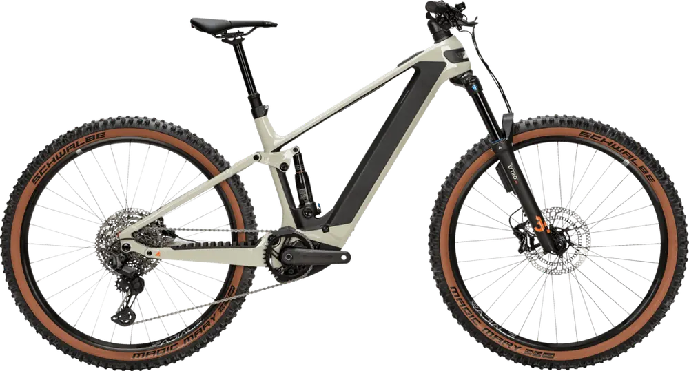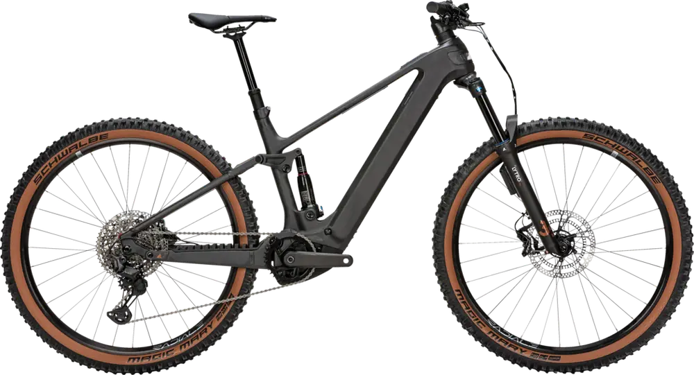 Rower elektryczny trail 29″ z ramą z włókna węglowego, pełnym zawieszeniem i komponentami wyższej klasy średniej.
