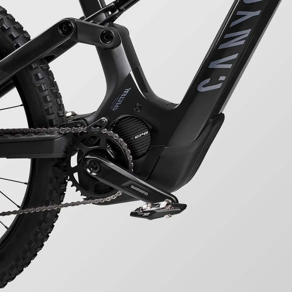 Canyon Spectral:ON CF, A progressive, playful full-carbon trail e-MTB engineered to eat up more trail in less time., Axle dimension: 12×148 mm, Material: Carbon (CF), Weight: 7.93 lbs, BB Standard: STEPS, Press Fit, Color: Stealth