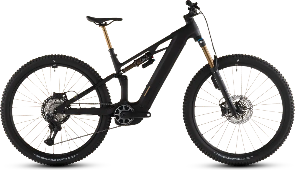 Front: Schwalbe Albert Trail Pro, Addix Soft, Kevlar, 2.5, Rear: Schwalbe Albert Gravity Pro, Addix Soft, Kevlar, 2.5