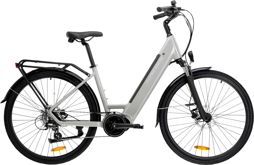 Rower elektryczny miejski z aluminiową ramą 28″, osprzętem podstawowym i mechanicznymi hamulcami tarczowymi.