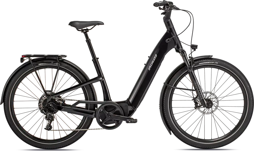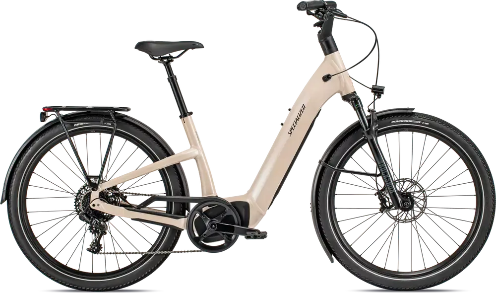 E5 Aluminum, bottom bracket motor mount, fully integrated & lockable downtube battery, internal cable routing, lock and front rack mount, Colors: Cast Black / Silver Reflective; Red Tint / Silver Reflective; Sand / Black Reflective