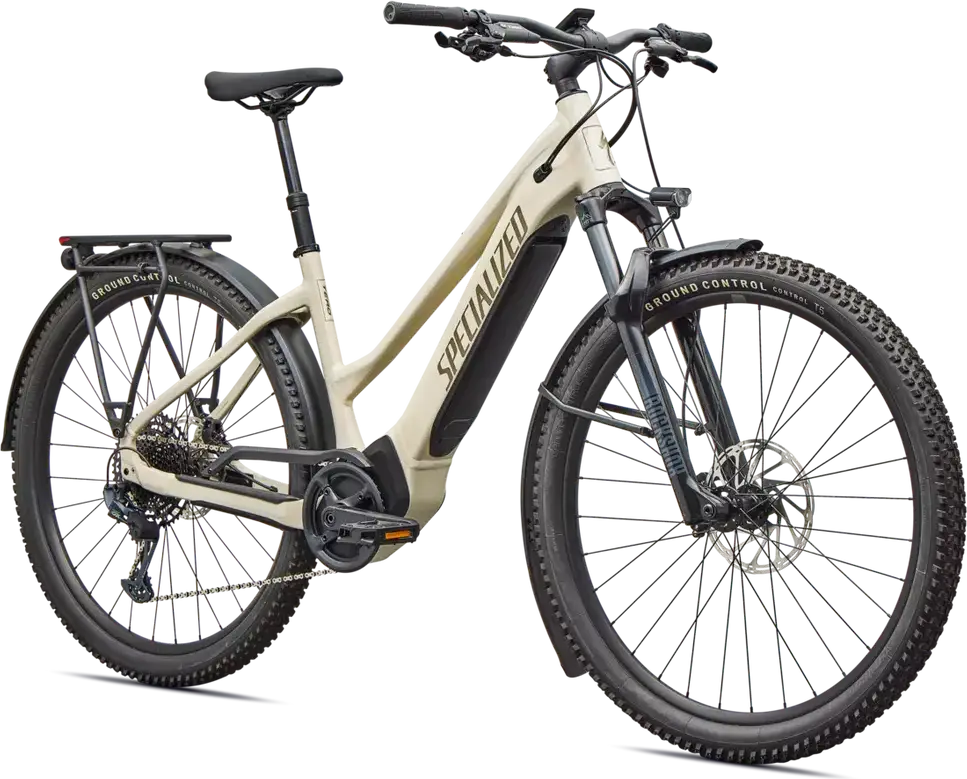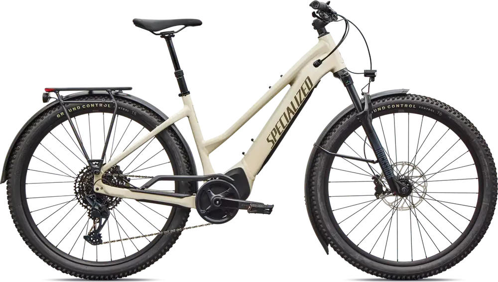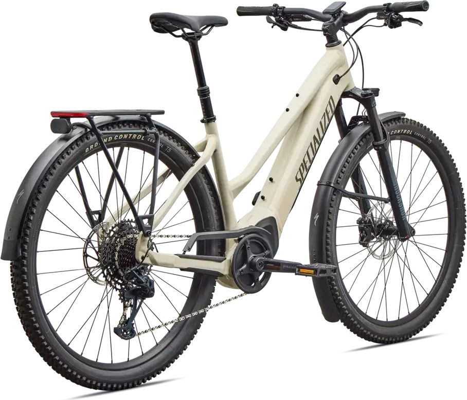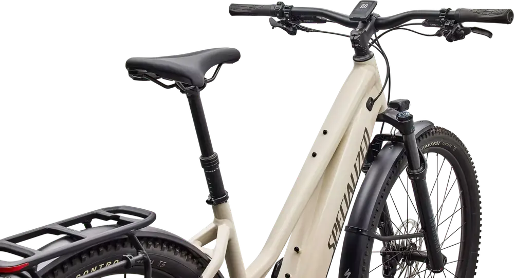 E5 Aluminum, mid-drive motor, fully integrated & lockable downtube battery, internal cable routing, wheel lock mount, and front rack compatible, Colors: Gloss White Mountains / Gunmetal; Gloss Pistachio / Dolomite