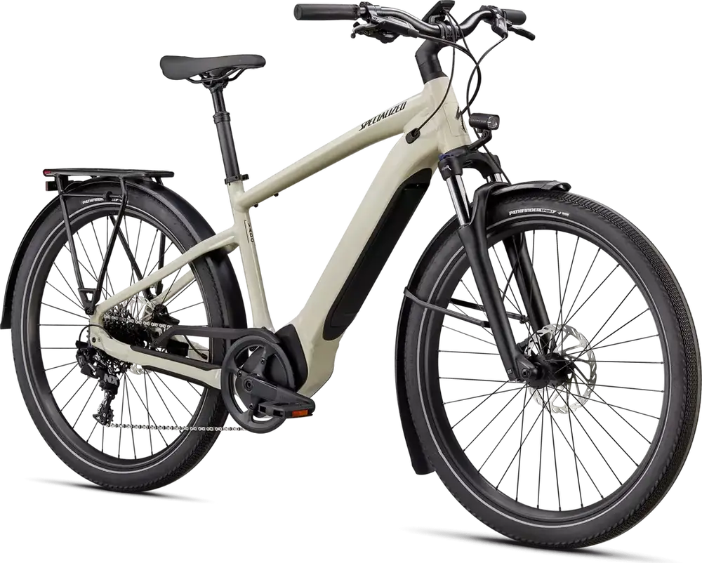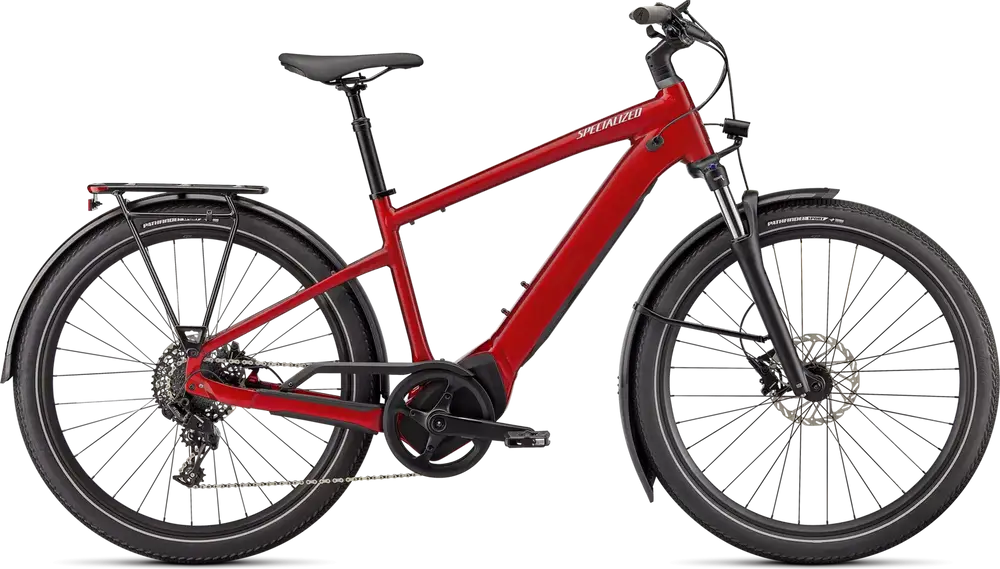 E5 Aluminum, bottom bracket motor mount, fully integrated & lockable downtube battery, internal cable routing, lock and front rack mount, sliding dropout, Colors: White Mountains / Black Reflecitve; Red Tint / Silver Reflective