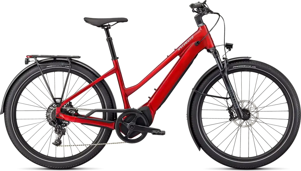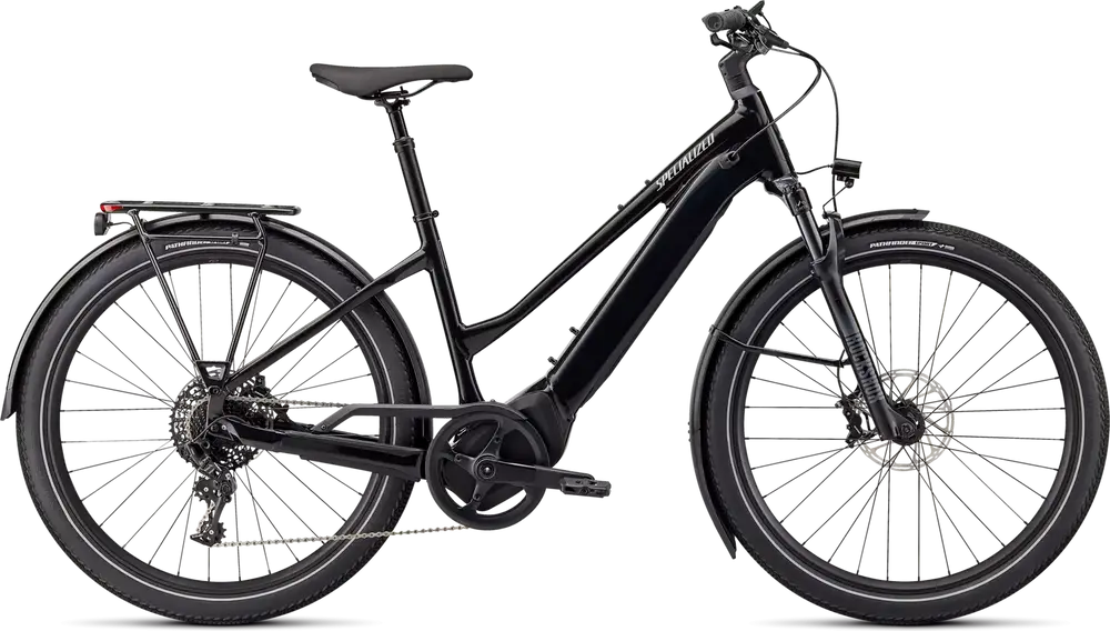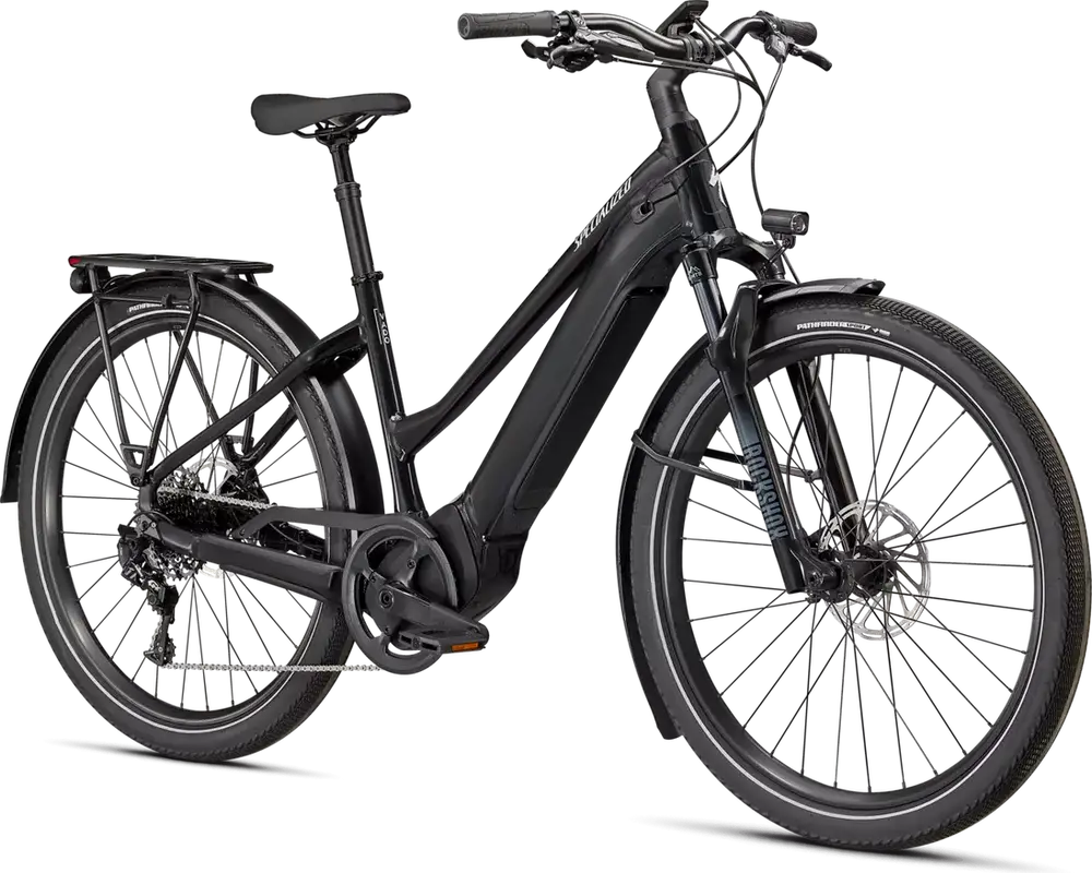 E5 Aluminum, bottom bracket motor mount, fully integrated & lockable downtube battery, internal cable routing, lock and front rack mount, Colors: Cast Black / Silver Reflective; Red Tint / Silver Reflective; White Mountains / Black Reflecitve1379_85e6ee-94> |