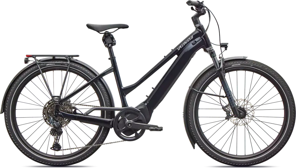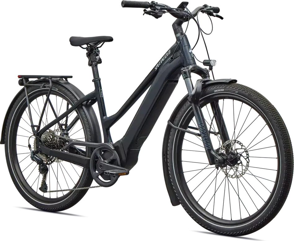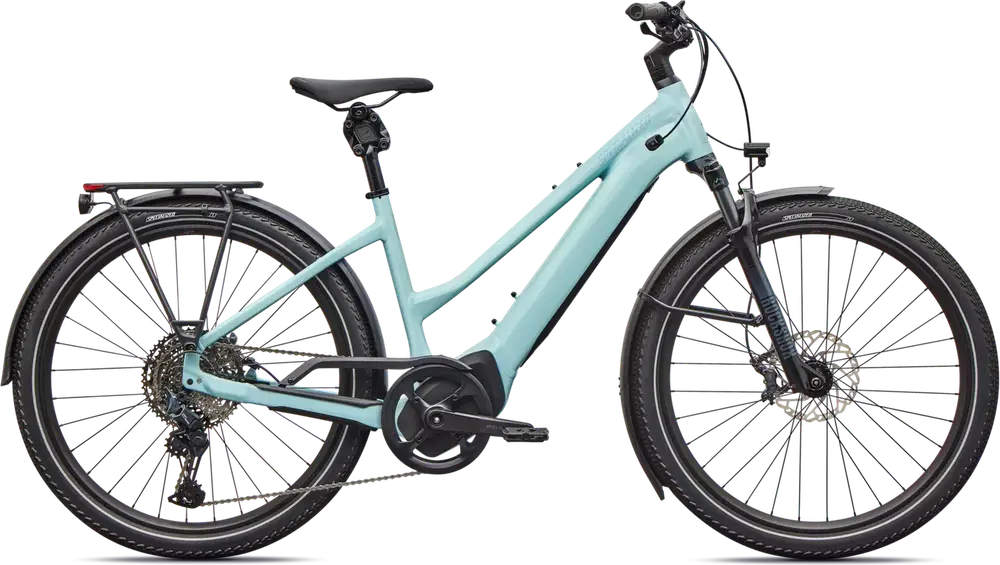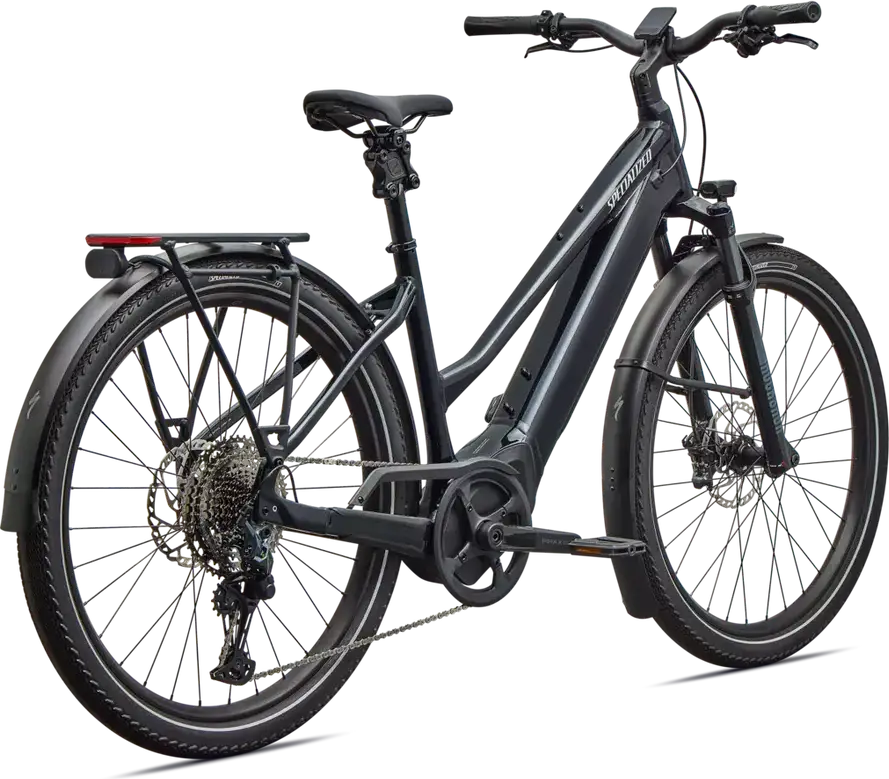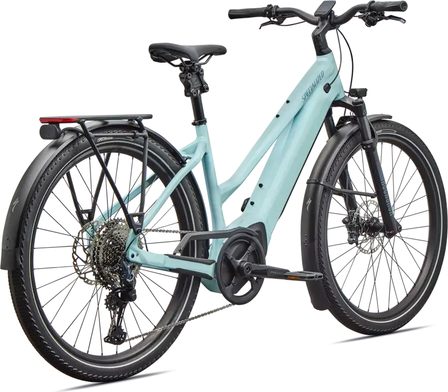 E5 Aluminum, mid-drive motor, fully integrated & lockable downtube battery, internal cable routing, wheel lock mount, and front rack compatible, Colors: Gloss Castblack / Satin Silver Reflective; Gloss Seafoam / 25% Lapis Pearl / Glacial Metallic1379_85e6ee-94> |