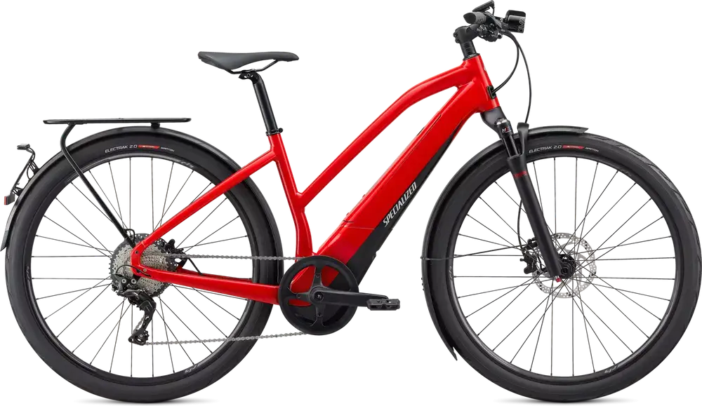 E5 Aluminum, bottom bracket motor mount, Fitness/Transportation Geometry, fully integrated & lockable down tube battery, internal cable routing, fender/rack mounts, Smooth Welds, Color: Flo Red W / Blue Ghost Pearl1379_85e6ee-94> |
