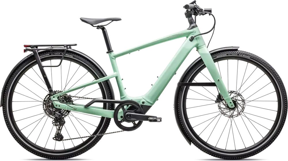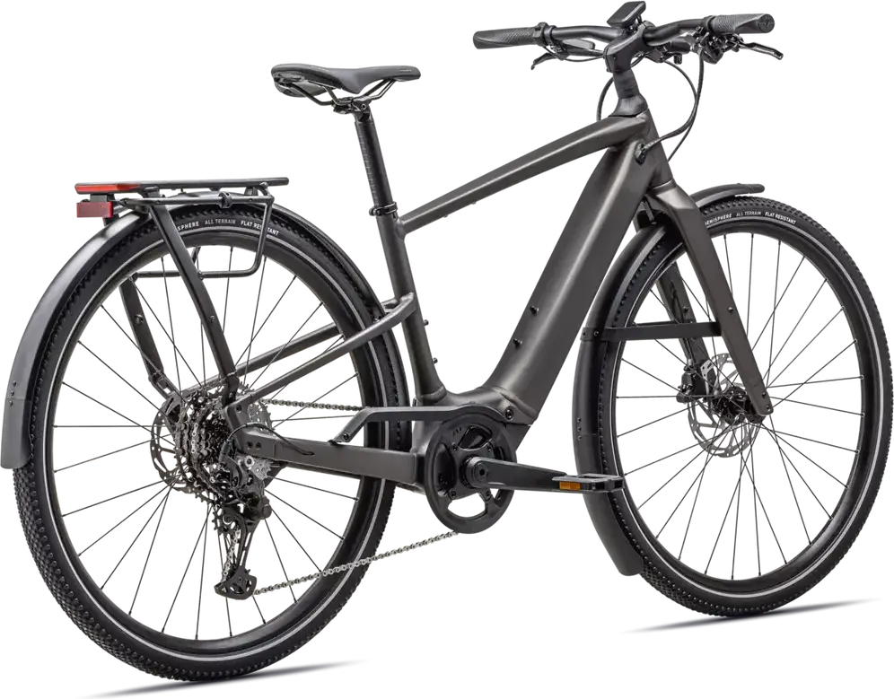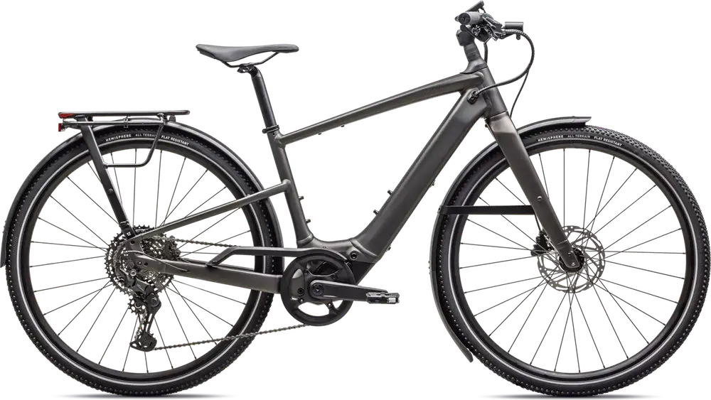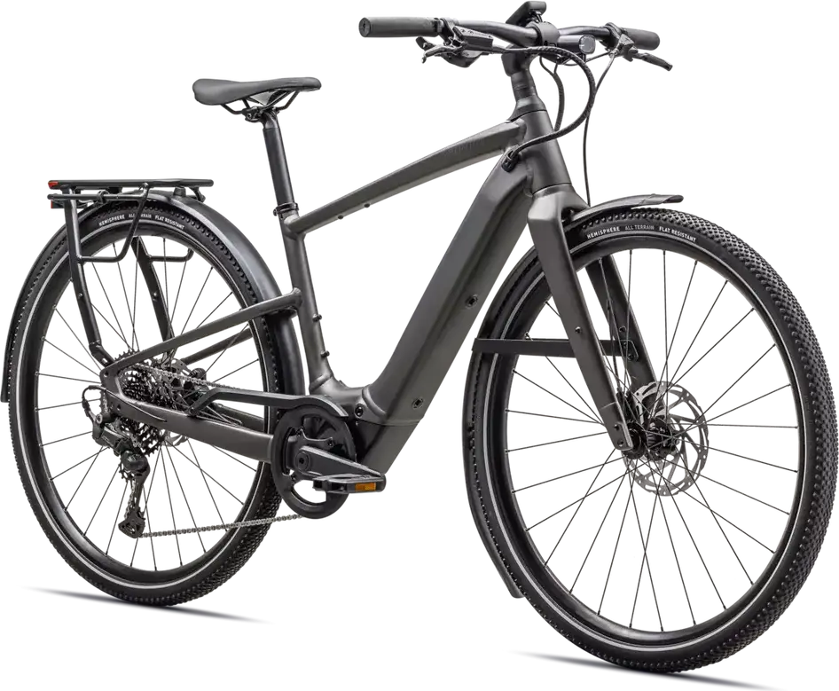 Front: Specialized Hemisphere flat protection, Reflective side walls, Wirebead, All terrain tire, 700x47c, Rear: Specialized Hemisphere flat protection, Reflective side walls, Wirebead, All terrain tire, 700x47c