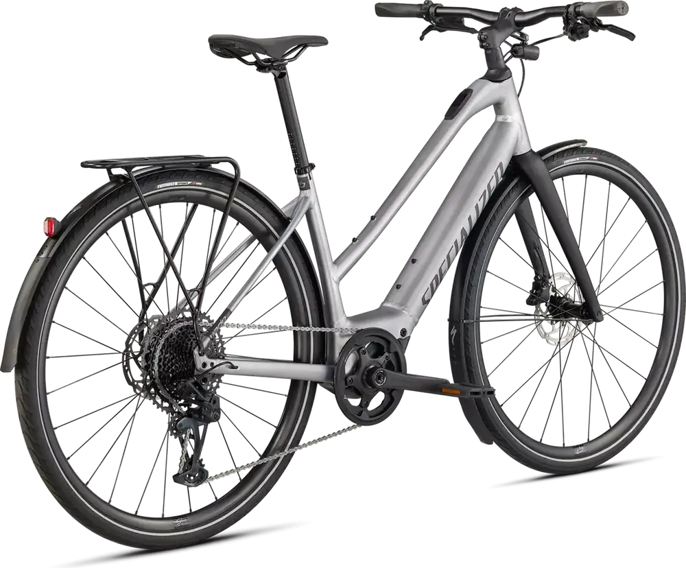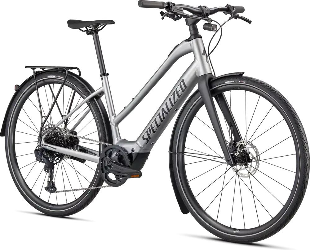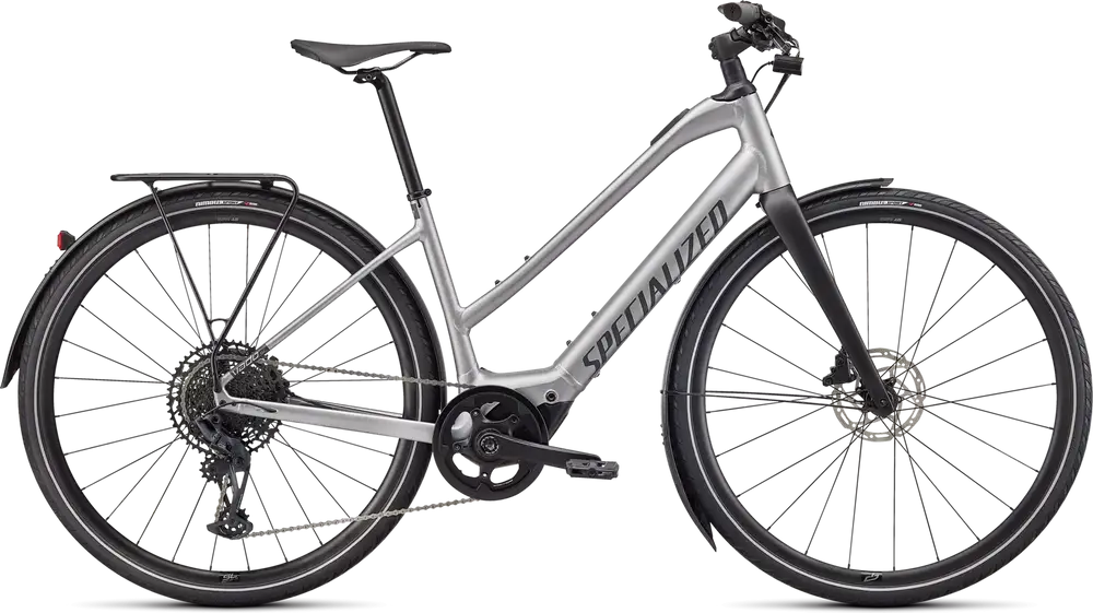 E5 Aluminum, bottom bracket motor mount, fully integrated downtube battery, internal cable routing, fender and front rack mounts, Smooth Welds, Color: Brushed Aluminum / Black Reflective